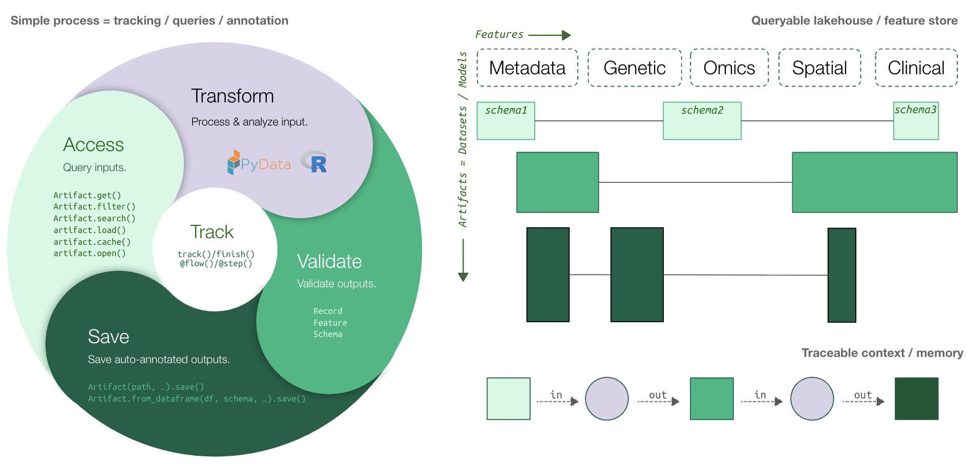 LaminDB is an open-source data framework for biology to query, trace, and validate datasets and models at scale. With one API, you get: lakehouse, lineage, feature store, ontologies, bio-registries & formats.
