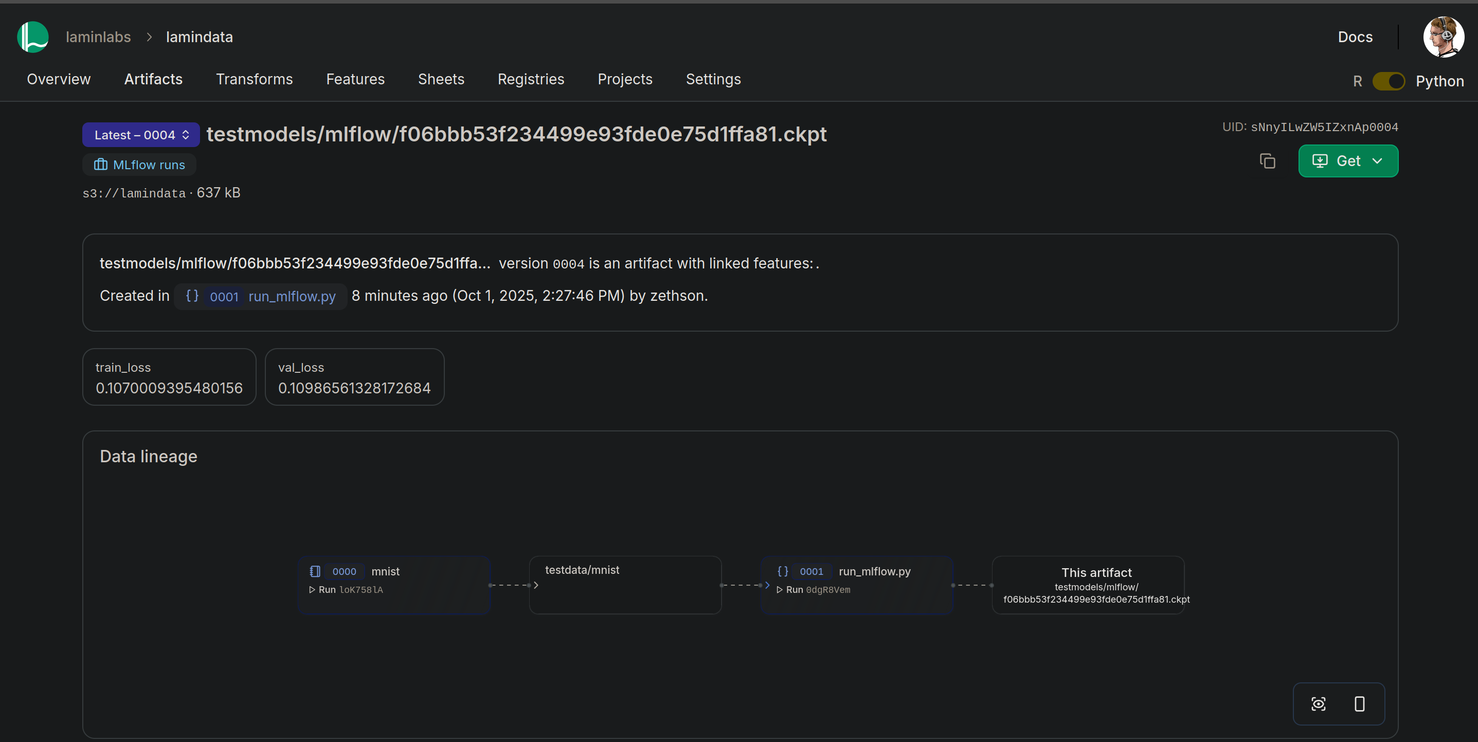 MLflow run details and LaminDB artifact details: