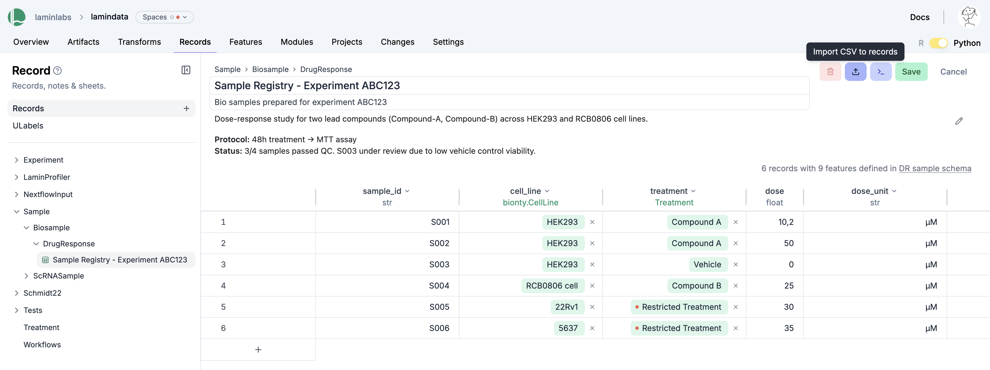Include a __lamindb_record_name__ column to set the name of each record (mapped to the record.name field and not shown as a data column).