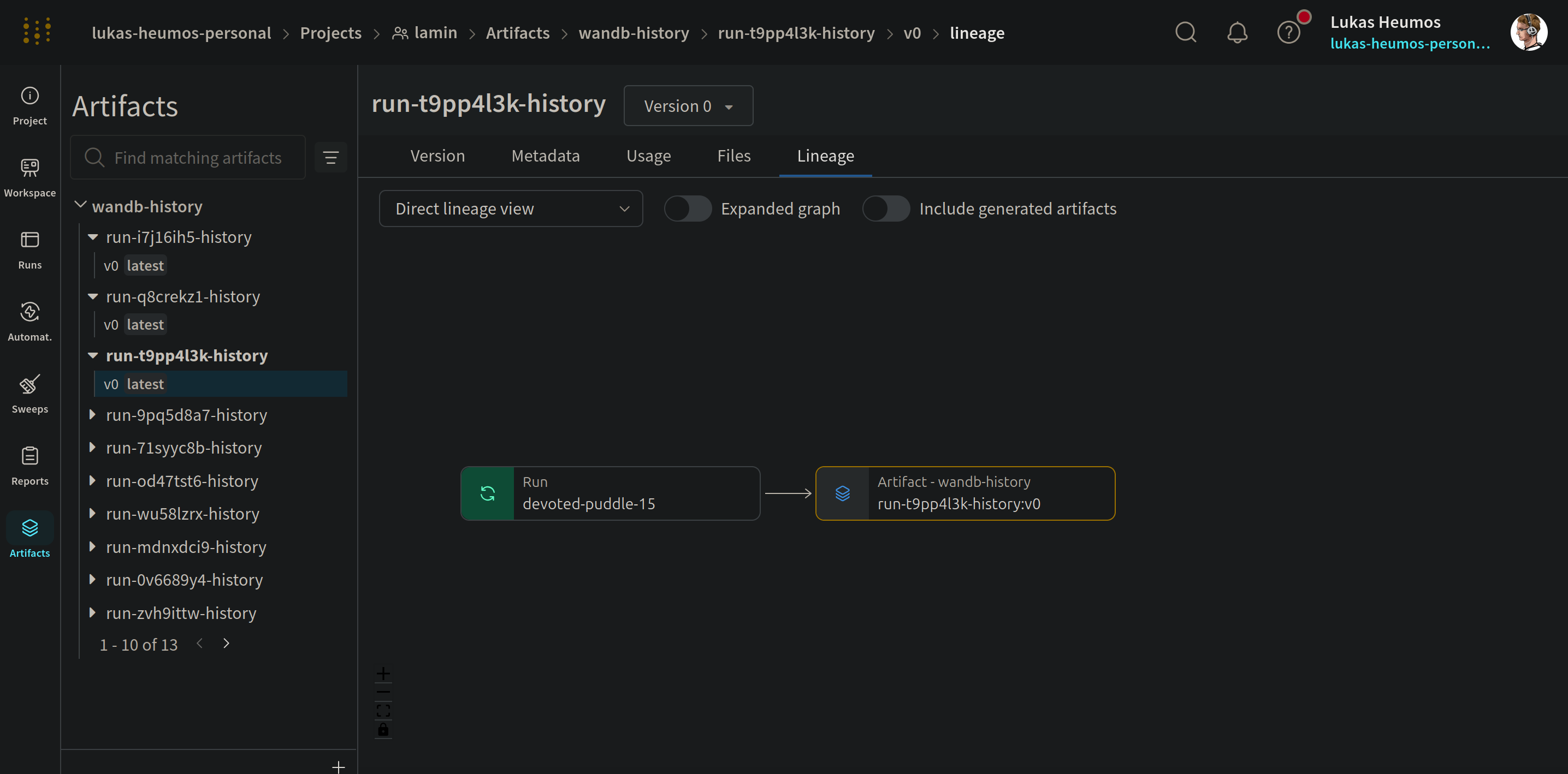 Both frameworks display output artifacts that were generated during the run. LaminDB further captures input artifacts, their origin and the associated source code.
