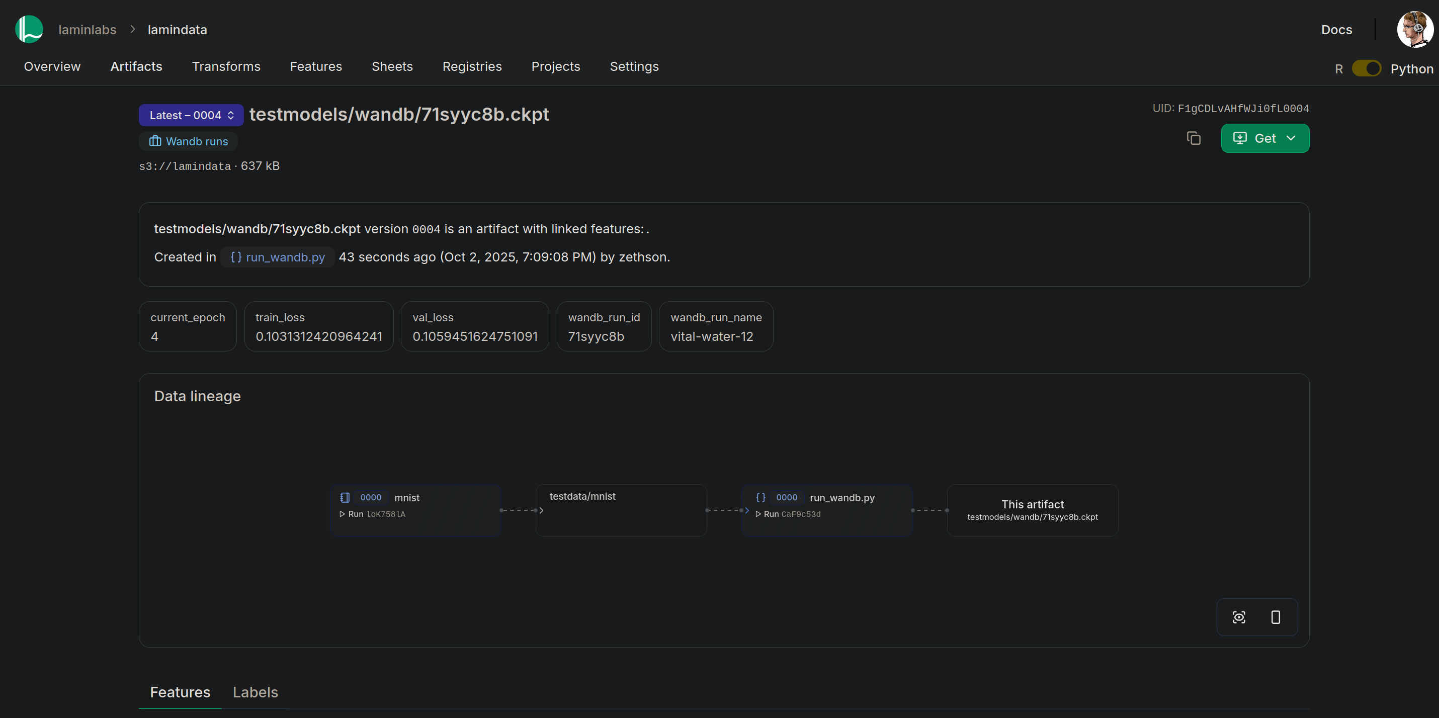 Artifact .ckpt ├── General │ ├── key: testmodels/wandb/fdt0o6p9.ckpt │ ├── uid: 0J6aomh6pPc19IWp0004 hash: i7ic854SN8RuZThoLxuY5w │ ├── size: 621.7 KB transform: wandb.ipynb │ ├── space: all branch: all │ ├── created_by: anonymous created_at: 2025-10-07 12:37:32 │ └── storage path: /home/runner/work/lamin-mlops/lamin-mlops/docs/lamin-mlops/testmodels/wandb/fdt0o6p9.ckpt ├── Linked features │ └── current_epoch int 4 │ train_loss float 0.11193325370550156 │ val_loss float 0.11464807391166687 │ wandb_run_id str fdt0o6p9 │ wandb_run_name str ethereal-dream-312 └── Labels └── .projects Project Wandb tutorial